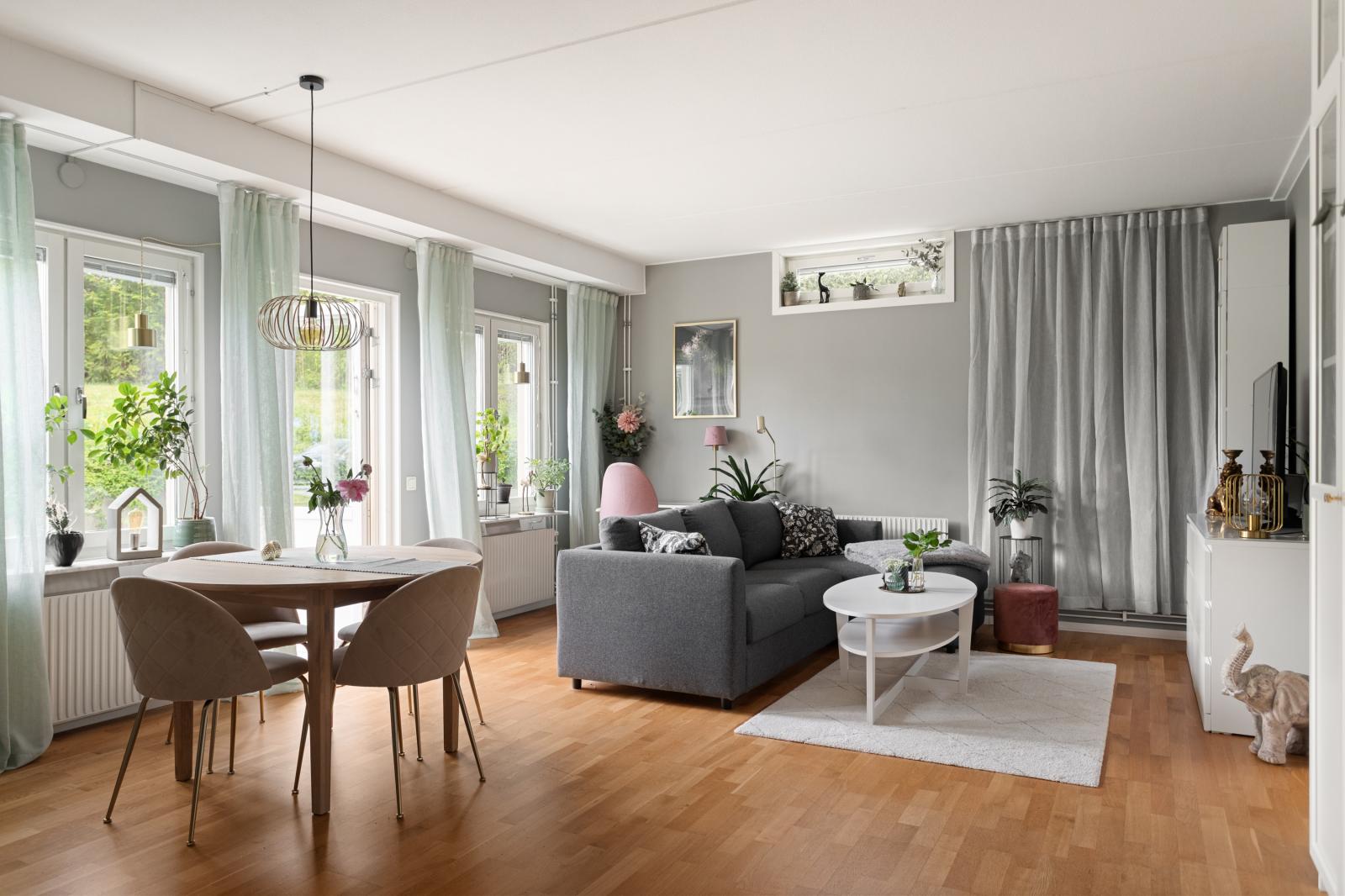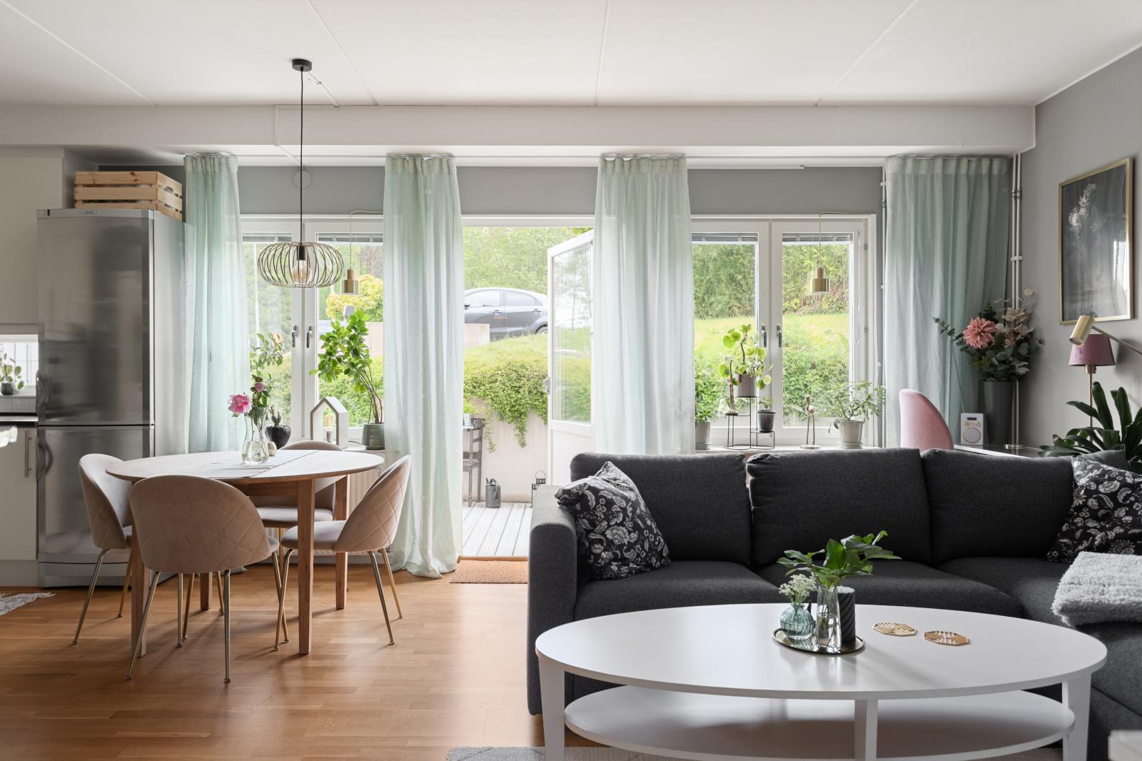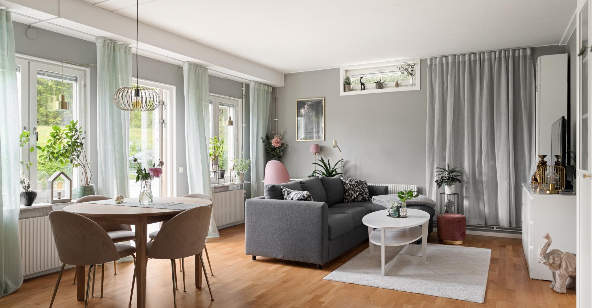 Mycket ljust och trevligt vardagsrum med fönster i söder och öster med utsikt mot uteplatsen. Här finns utrymme för både matplats och umgängesdel med soffgrupp och kanske en arbetsplats som i dagsläget.