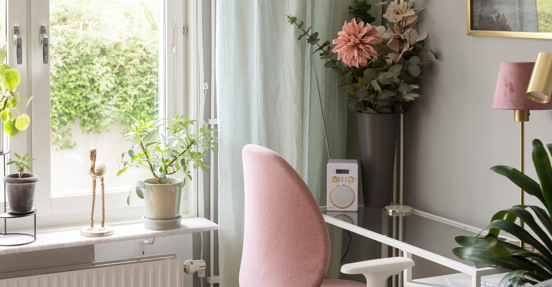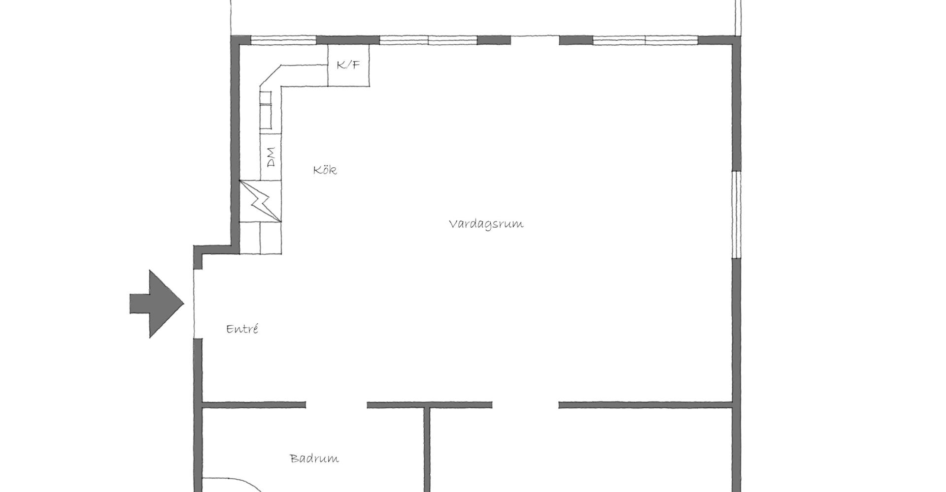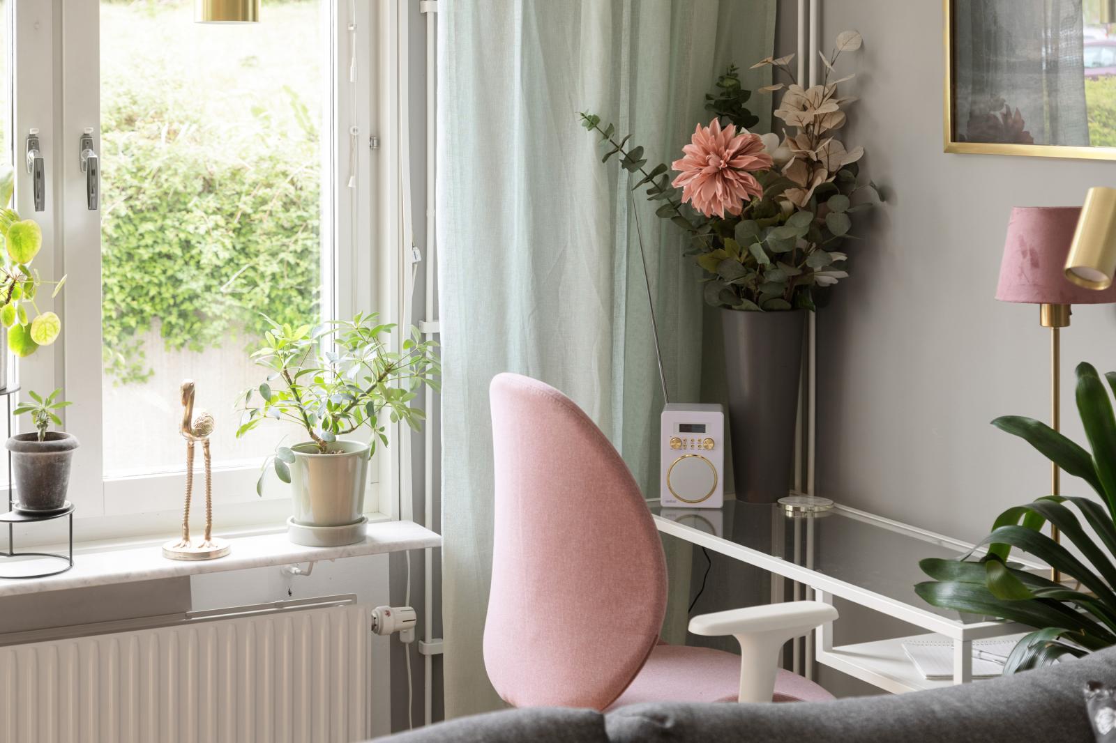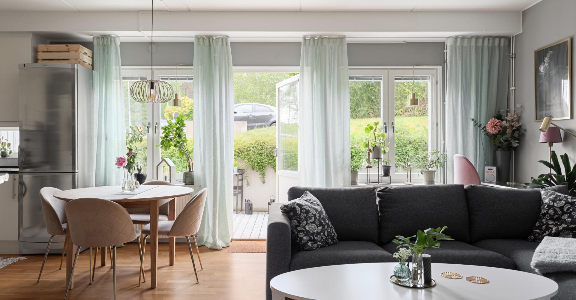 Mycket ljust och trevligt vardagsrum med fönster i söder och öster med utsikt mot uteplatsen. Här finns utrymme för både matplats och umgängesdel med soffgrupp och kanske en arbetsplats som i dagsläget.