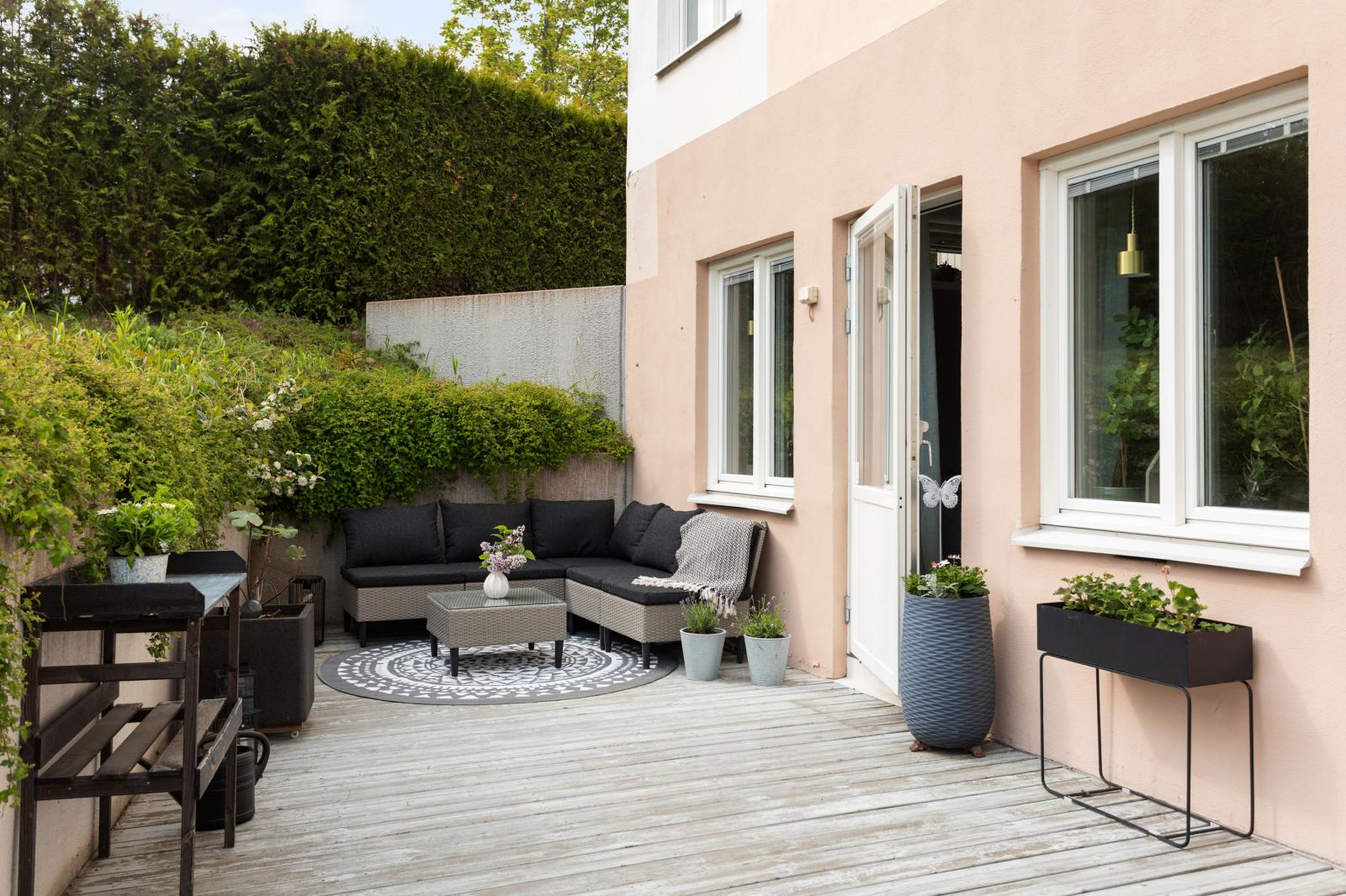 Mycket fräsch och välplanerad lägenhet med egen terrass om ca 20 kvm med trädäck. Här finns gott om plats för möblemang för sommarens alla måltider ute och för dig som är intresserad av växter finns stora möjligheter. Tillträde är möjligt så du hinner njuta av terrassen redan i sommar. Det fina köket är i öppen planlösning med vardagsrummet och takhöjden om 2,6 m samt alla fönster mot terrassen gör lägenheten ljus och hemtrevlig. Det rymliga badrummet är välutrustat med bl a tvättmaskin och torktumlare.