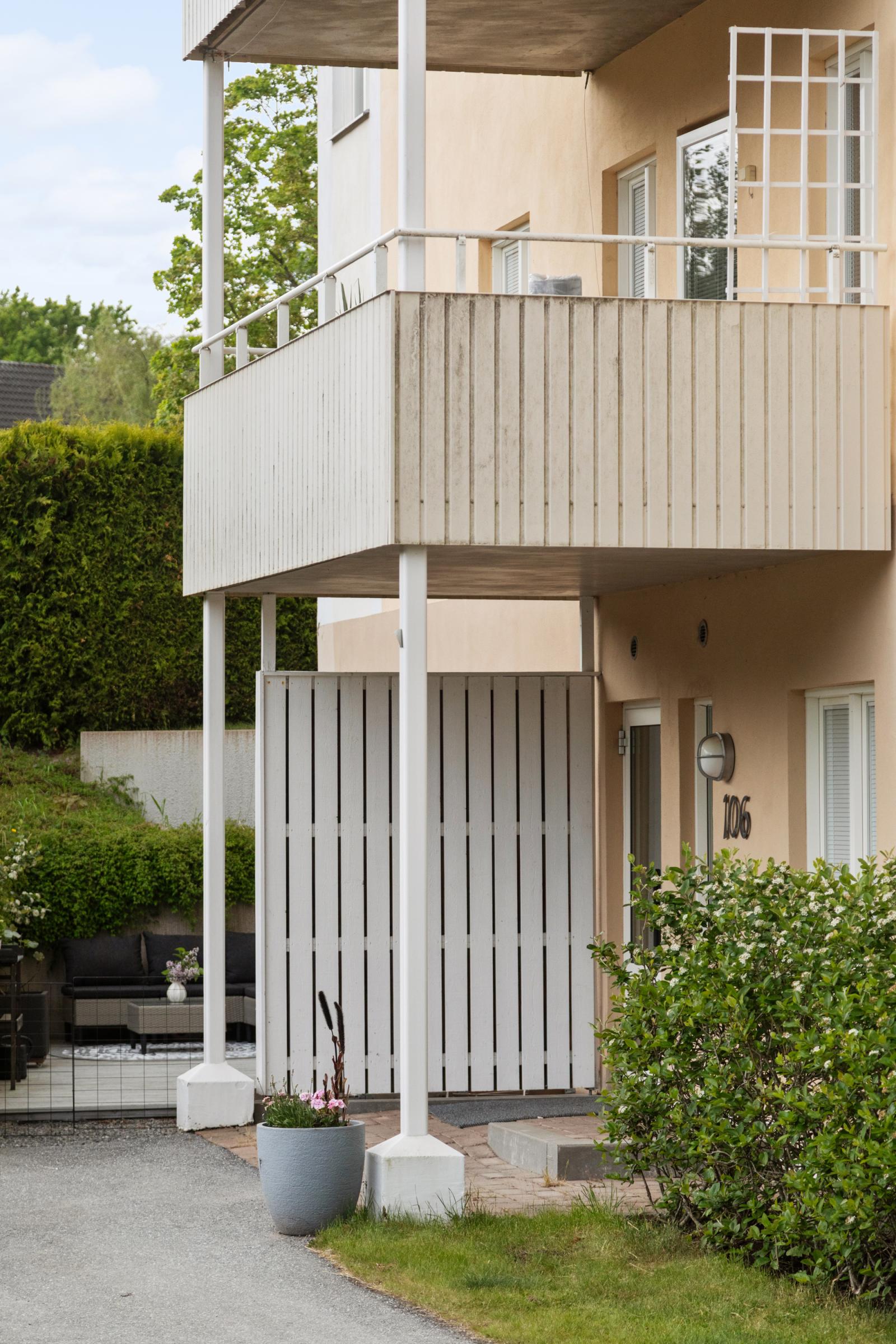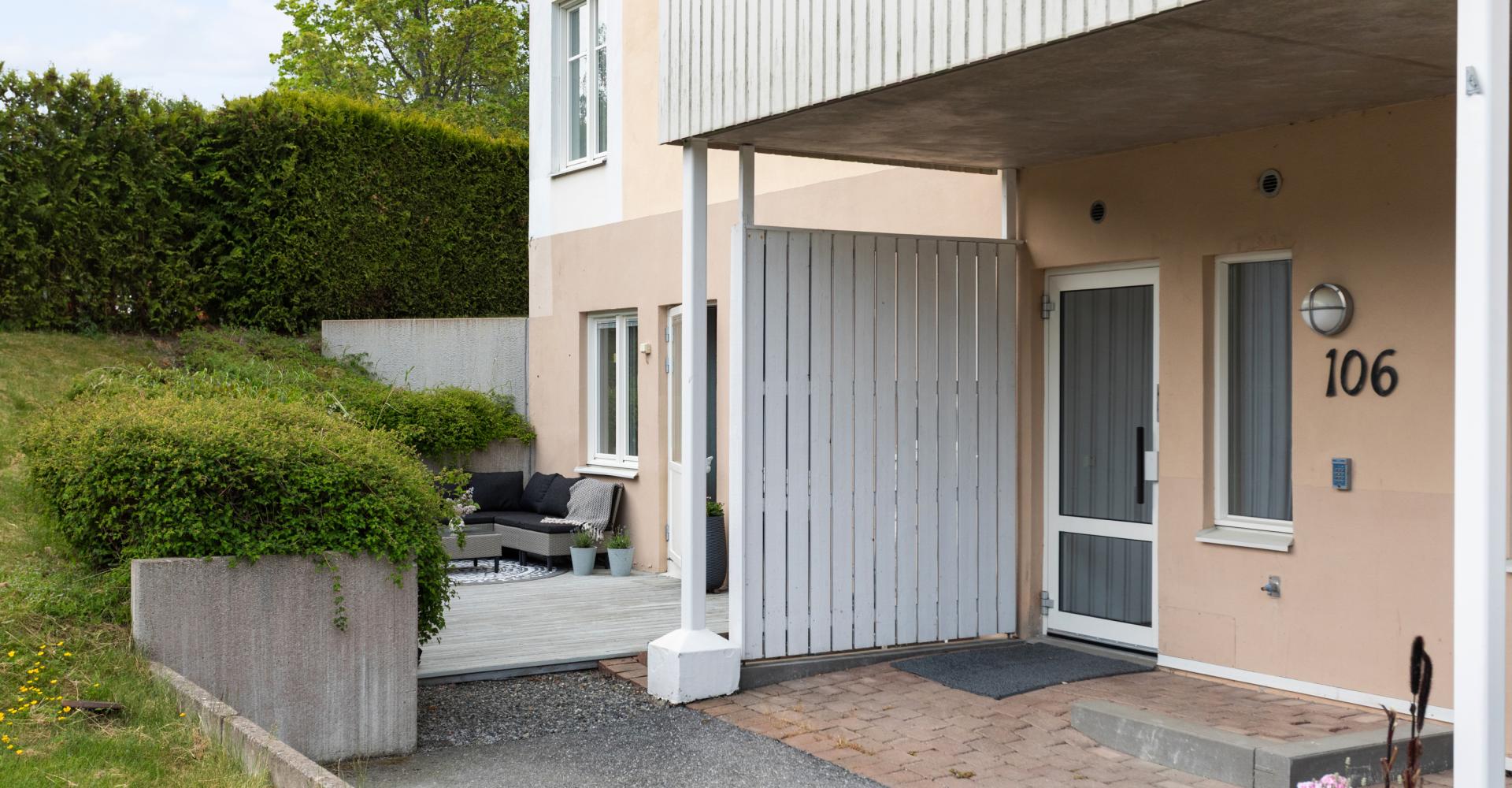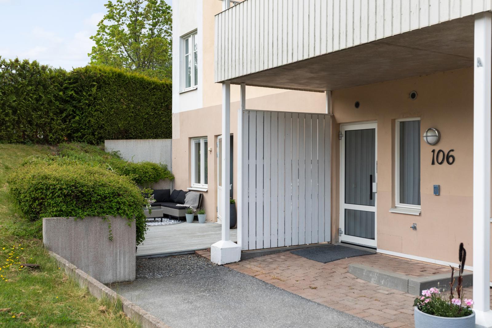Lägenheten har ett hörnläge i markplan och nås enkelt utan att du behöver ta ett enda trappsteg. Det är entré till lägenheten från husets insida och terrassdörren kan bara öppnas inifrån. På samma plan finns ett förråd som hör till lägenheten och har du bil finns parkeringsplats att hyra i närheten. Huset är byggt 2005 så allt är modernt och fortfarande fräscht. Föreningen är lagom stor med sina 42 lägenheter och både teknisk och ekonomisk förvaltning sköts av välrenommerade SBC. Föreningen äger marken och har inga stora renoveringar eller avgiftsändringar inplanerade.