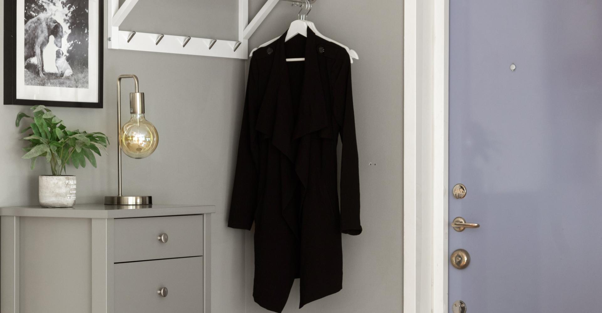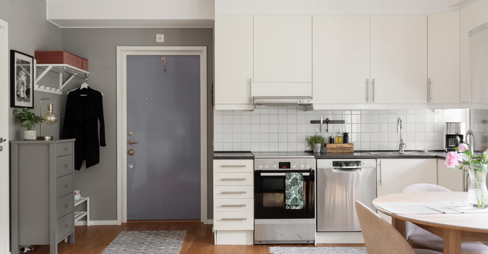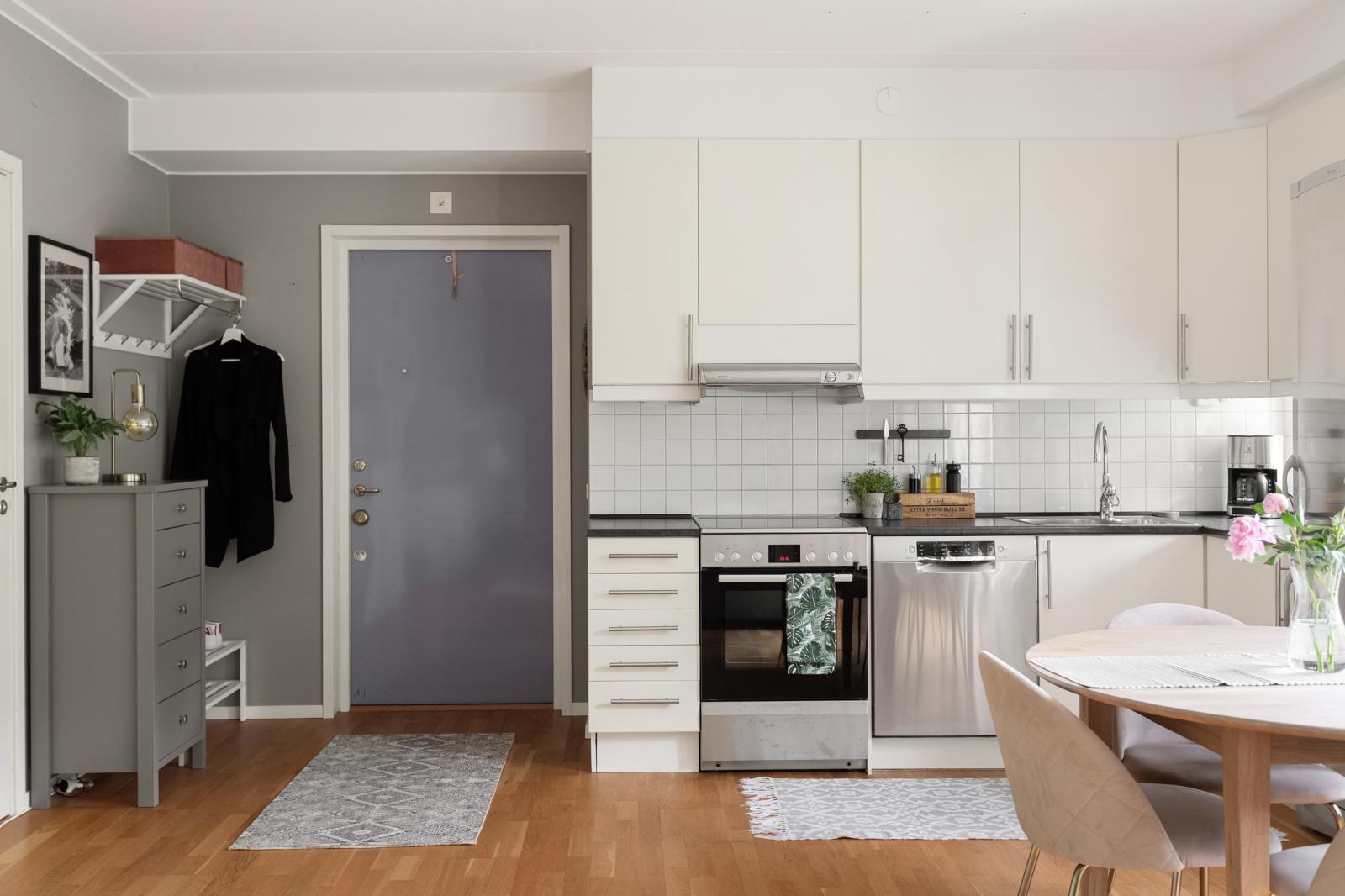 Entré med plats för ytterkläder. Det är samma trägolv i hela lägenheten och väggarna är målade i grå nyans. Säkerhetsdörr i vacker lavendelblå färg och med tittöga mot trapphuset. Från hallen ser du direkt ut mot kök och vardagsrum.