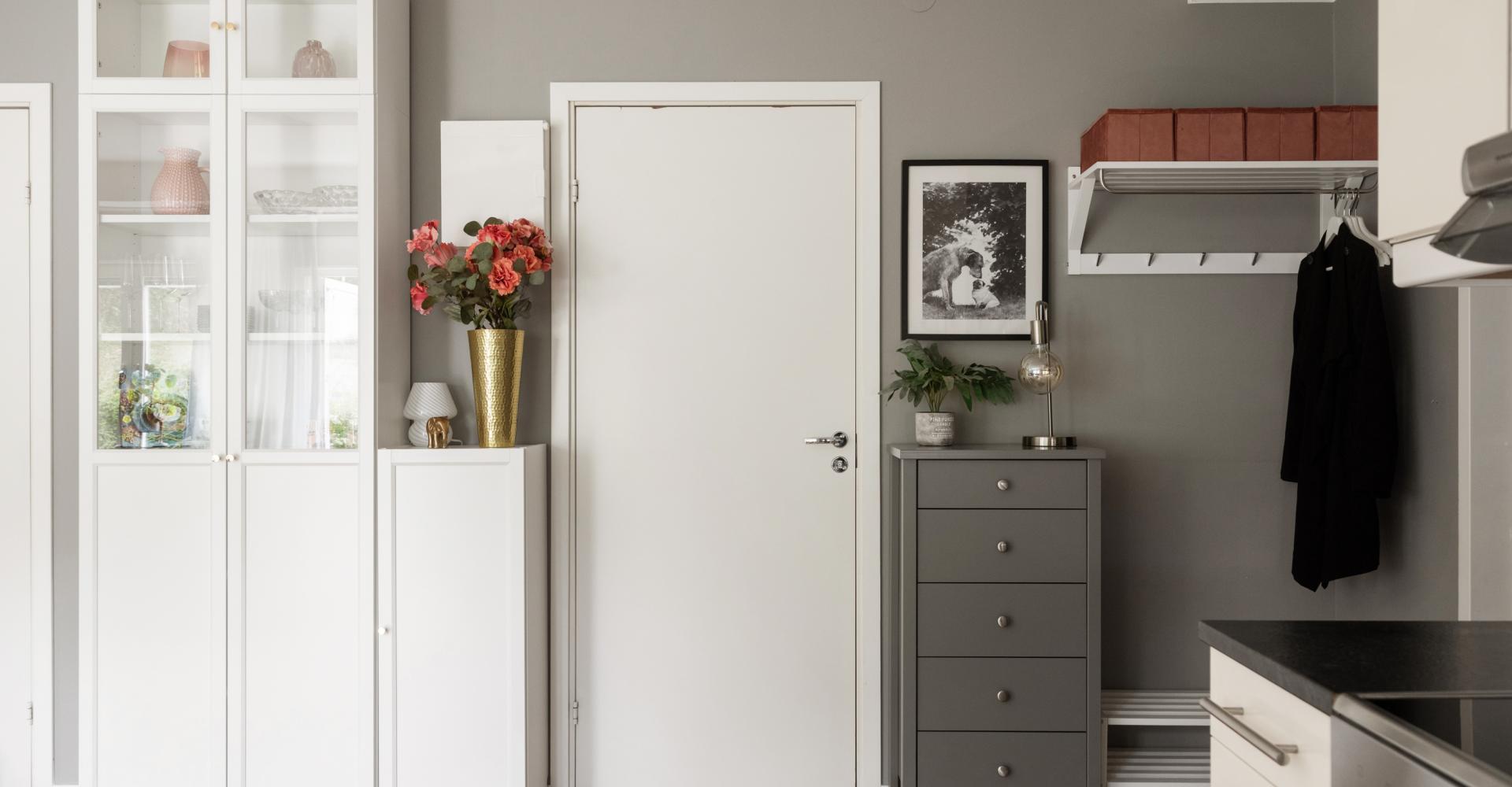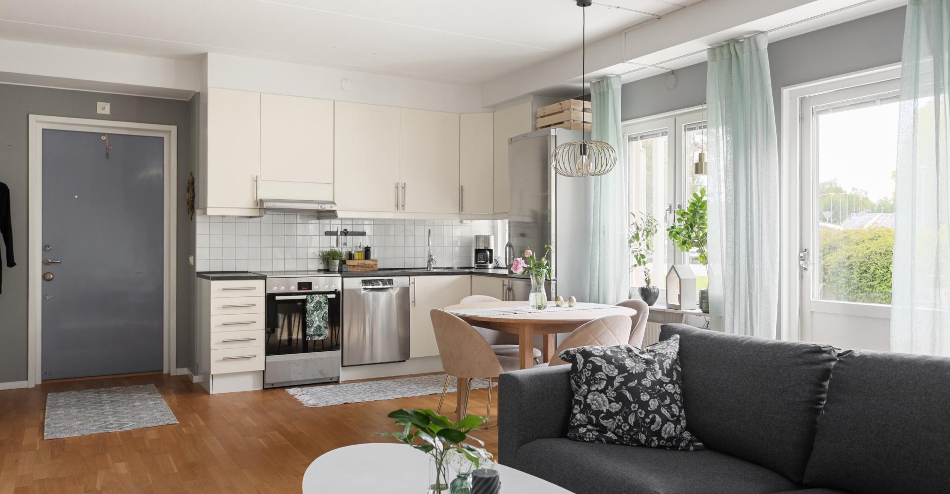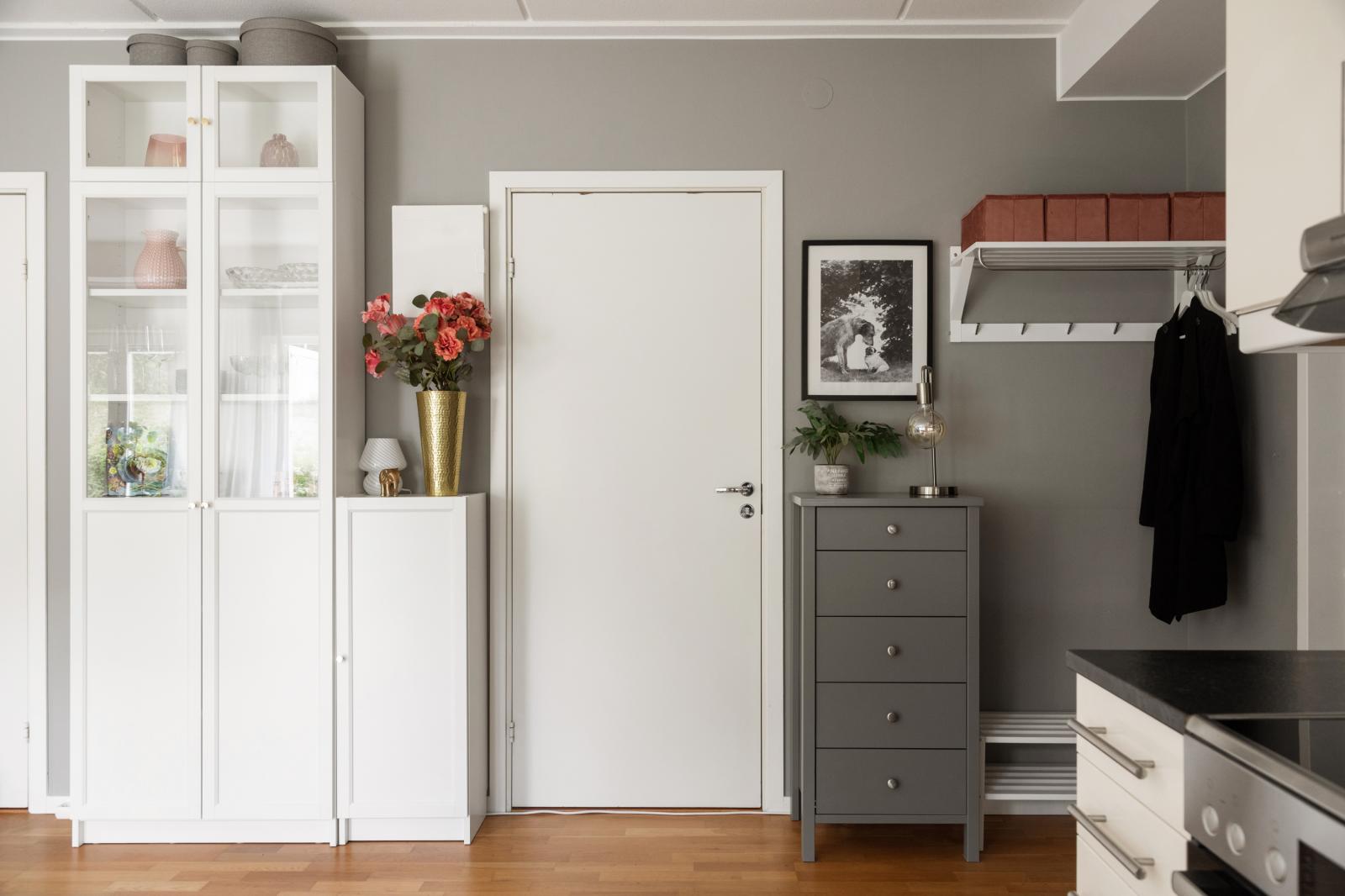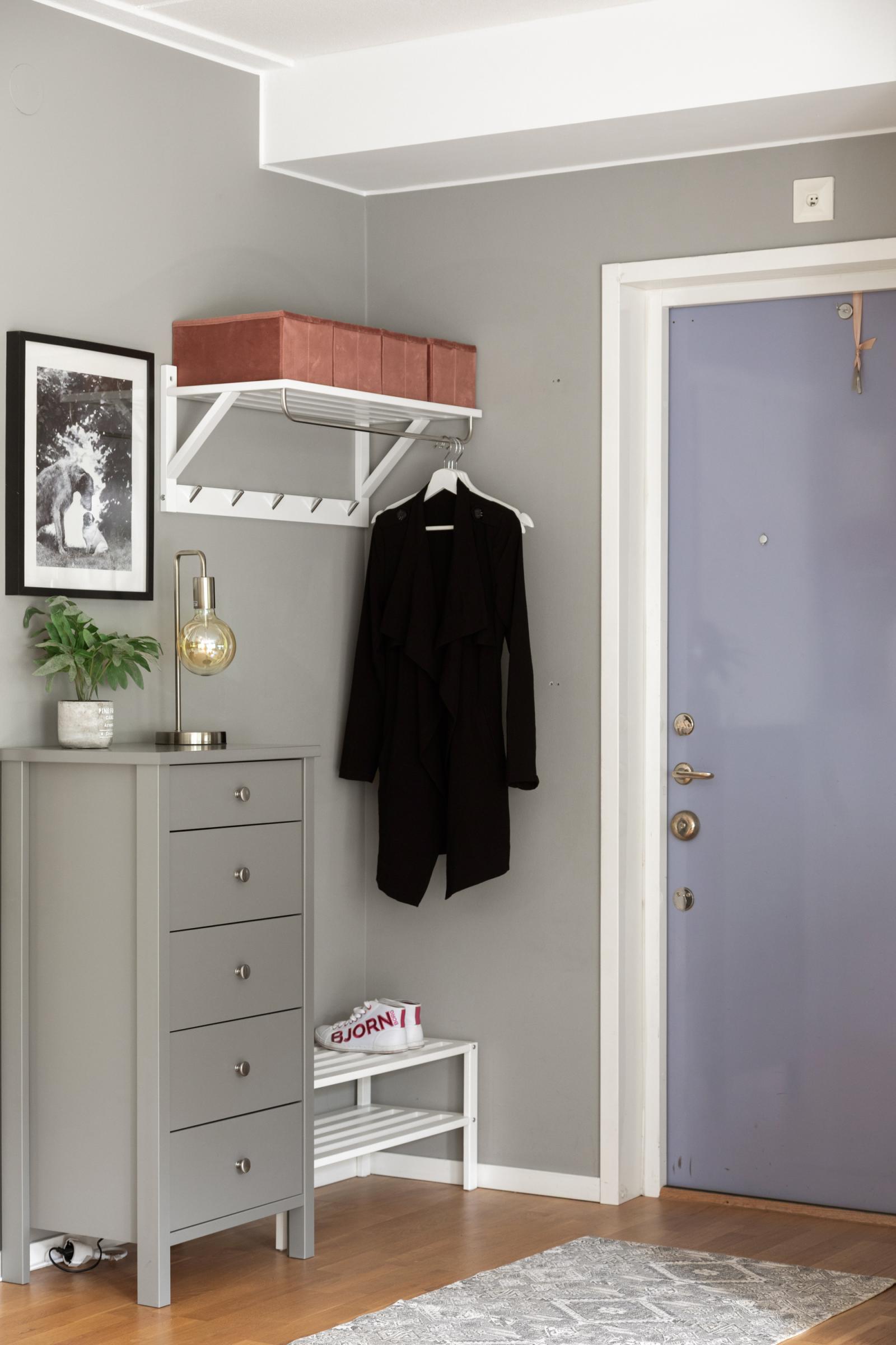 Entré med plats för ytterkläder. Det är samma trägolv i hela lägenheten och väggarna är målade i grå nyans. Säkerhetsdörr i vacker lavendelblå färg och med tittöga mot trapphuset. Från hallen ser du direkt ut mot kök och vardagsrum.