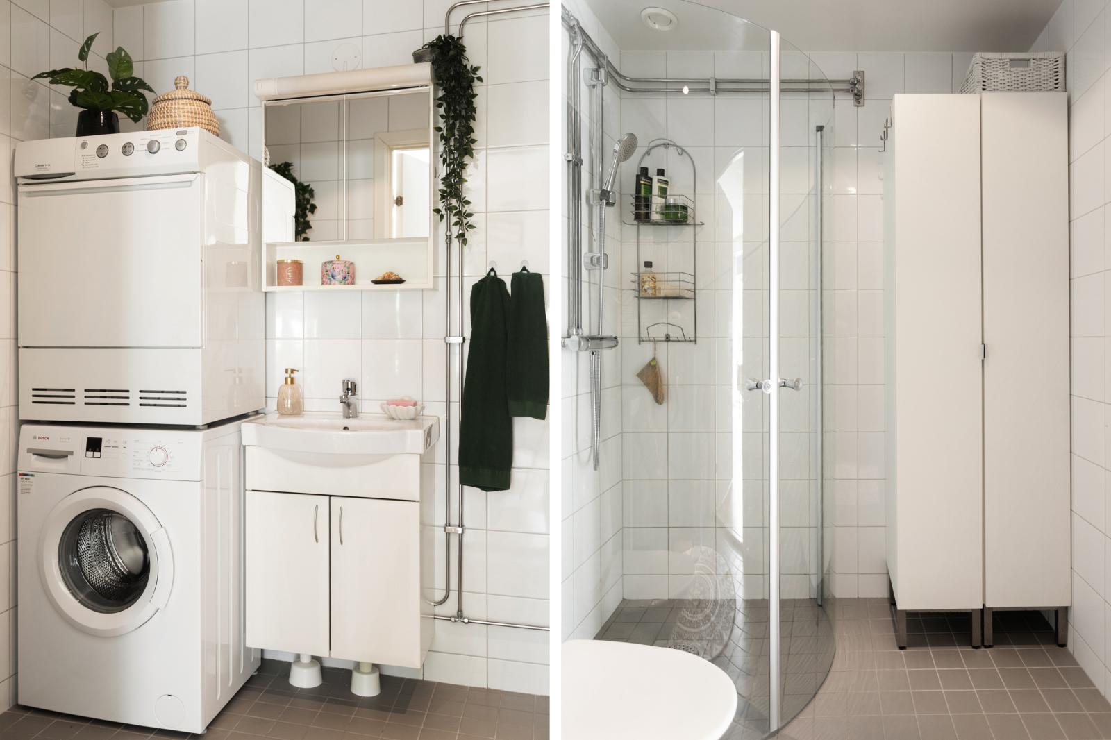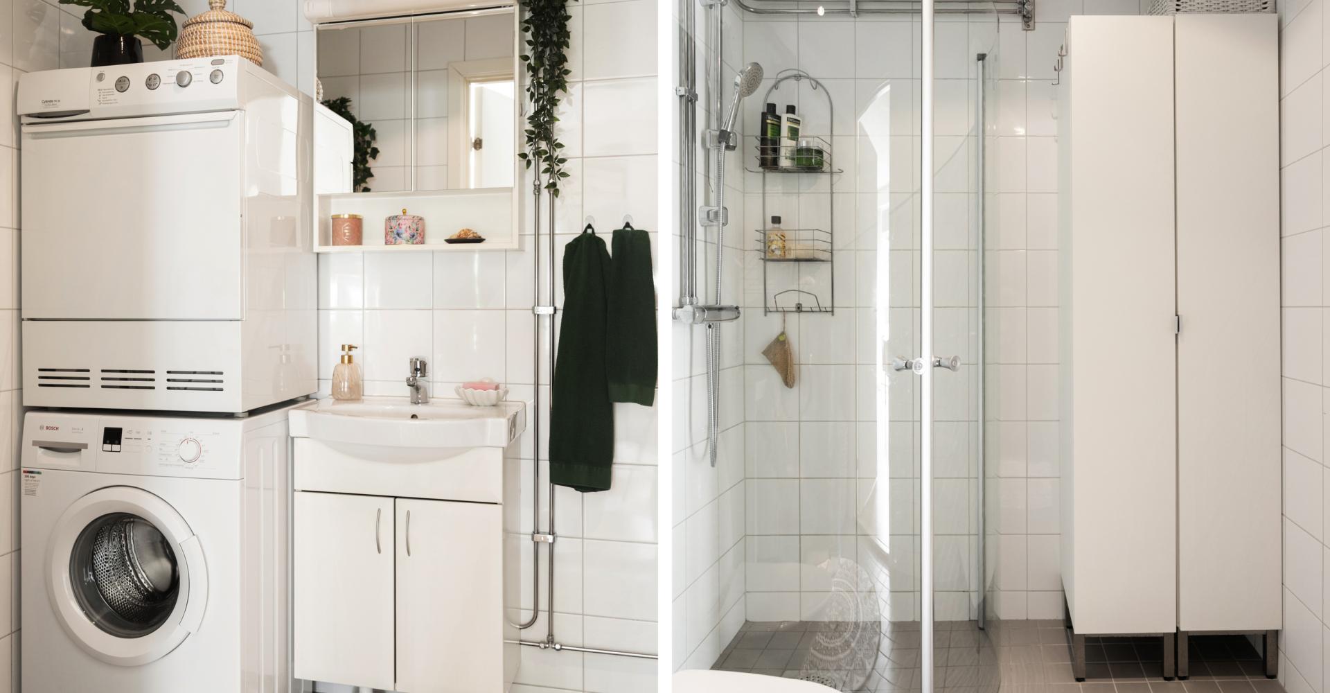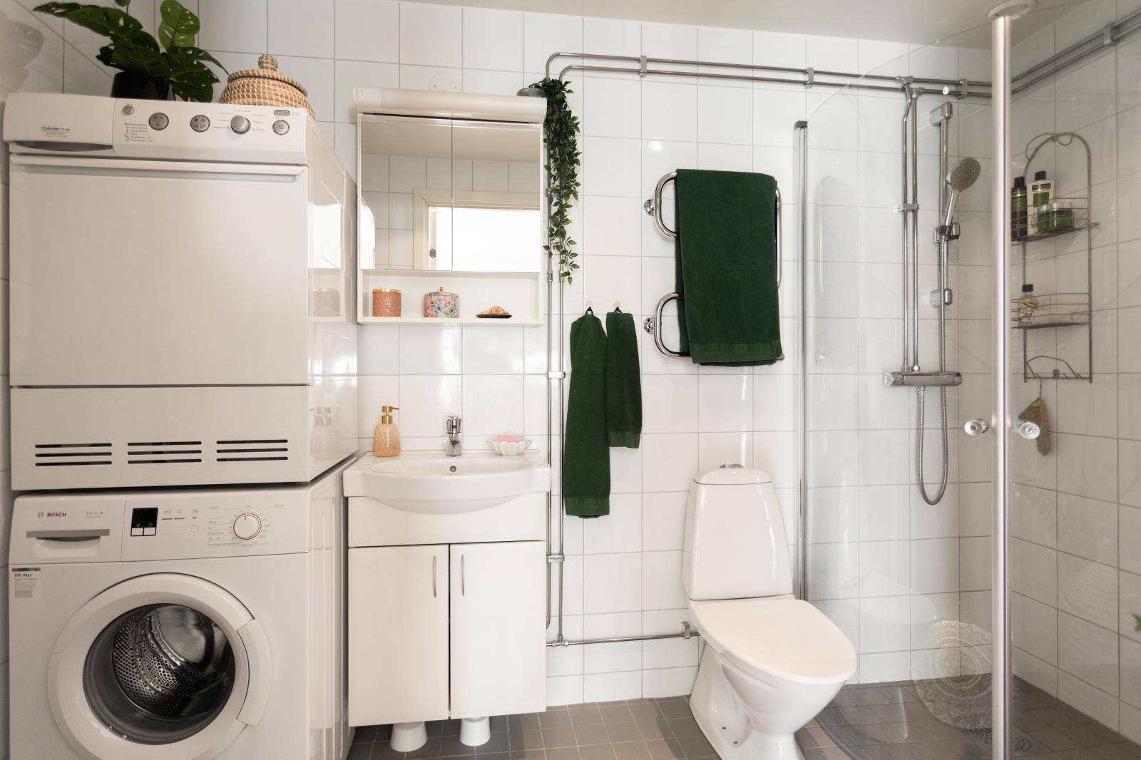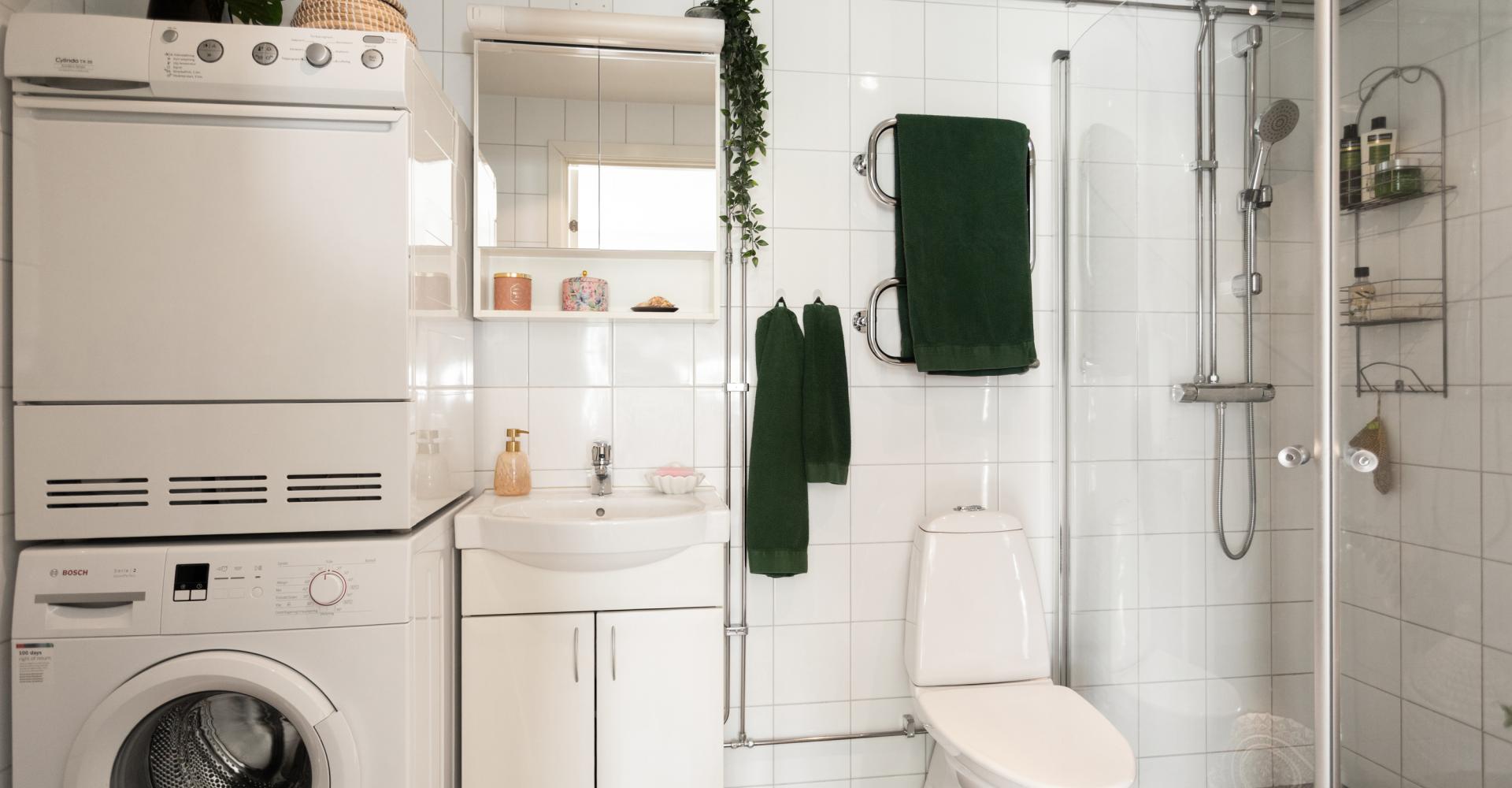 Helkaklat och stort badrum i vitt samt grått klinkers. Här finns tvättpelare med tvättmaskin och torktumlare, duschhörna med glasdörarr, wc, tvättställ med underskåp, badrumsskåp med spegel och belysning, handduksvärmare, golvvärme samt takspotar.