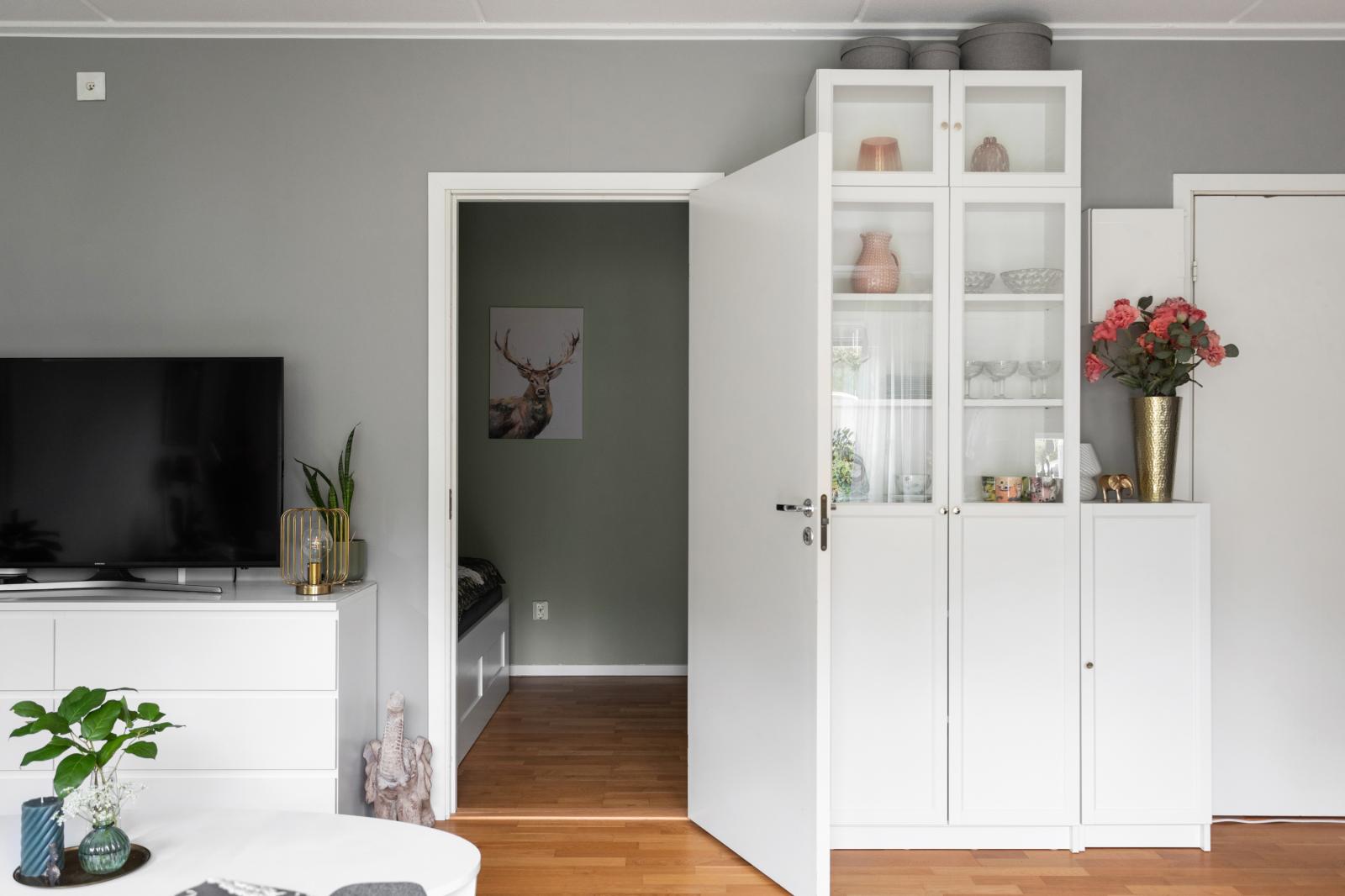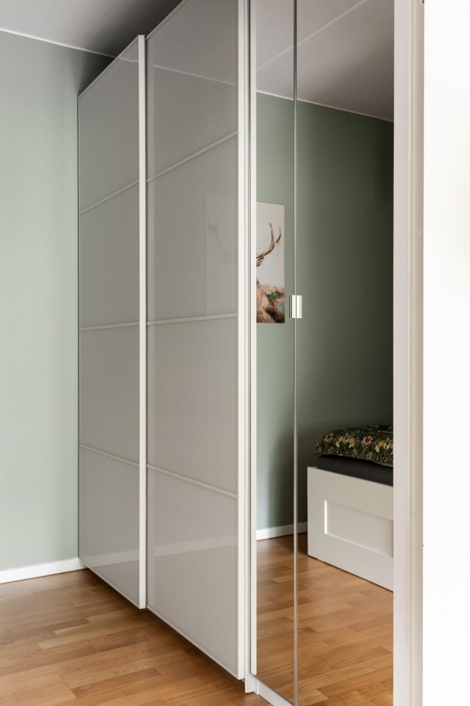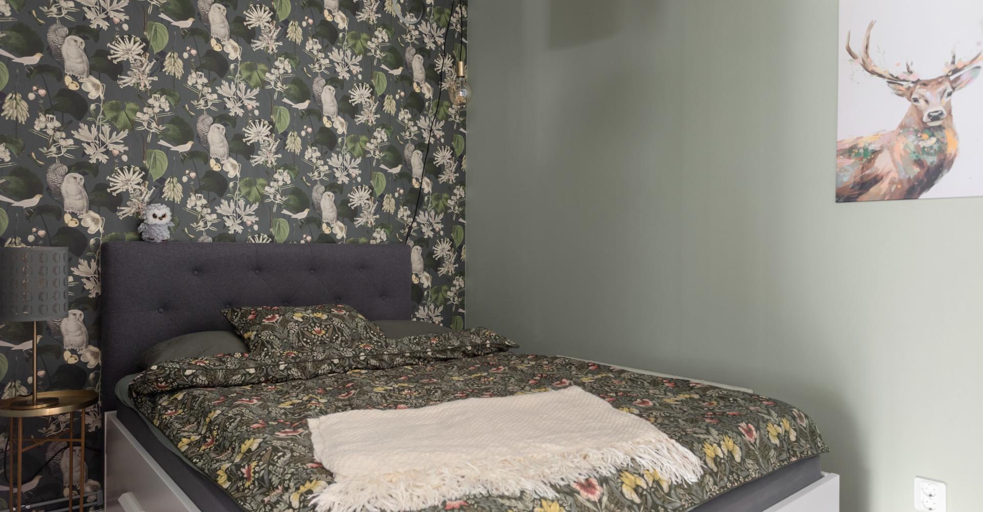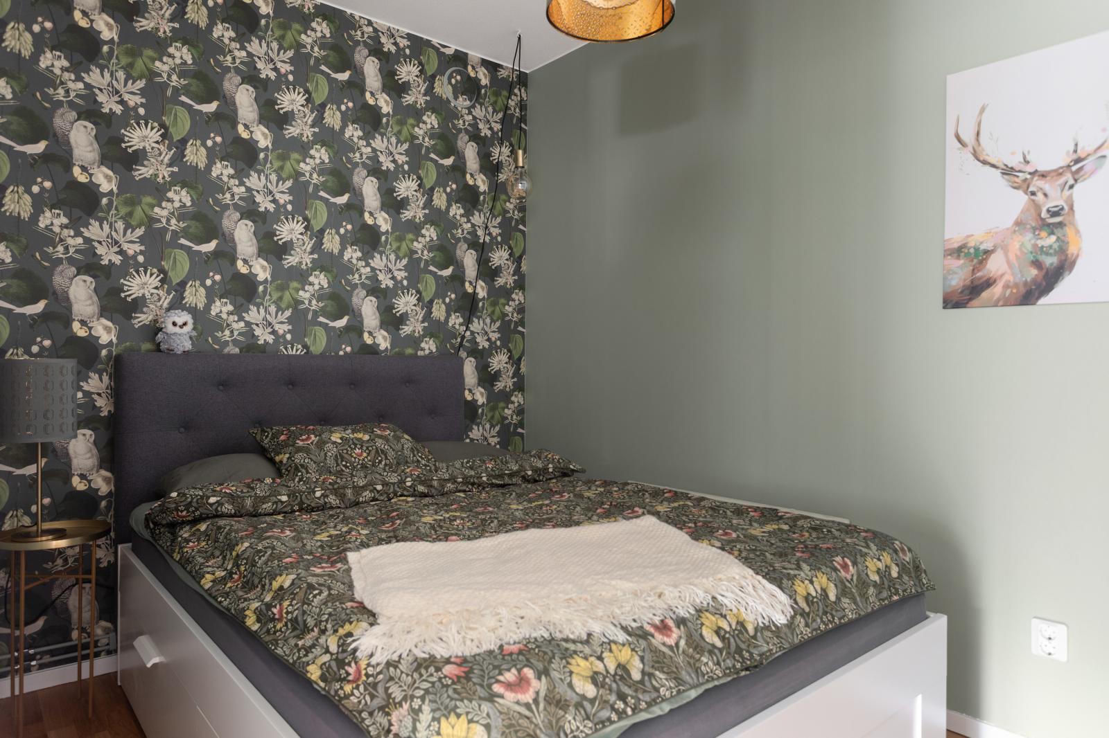 Lägenheten är registrerad som 2:a i föreningen, men det saknas fönster med direkt dagsljus så jag som mäklare behöver säga att lägenheten har 1,5 rum. I rummet finns plats för 180 cm bred säng, sängen på bilderna är 140 cm bred. Väggarna i sovrummet är målade i grågrön nyans samt en tapetserad fondvägg med nattugglor. Till höger om dörren in till sovrummet ryms en hel garderobsvägg.