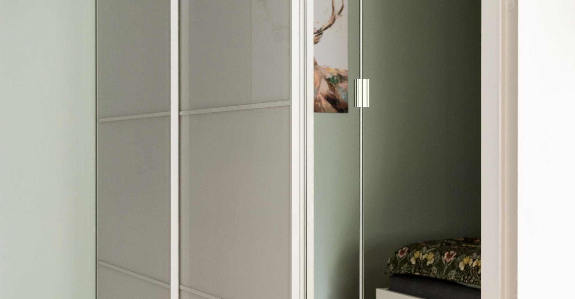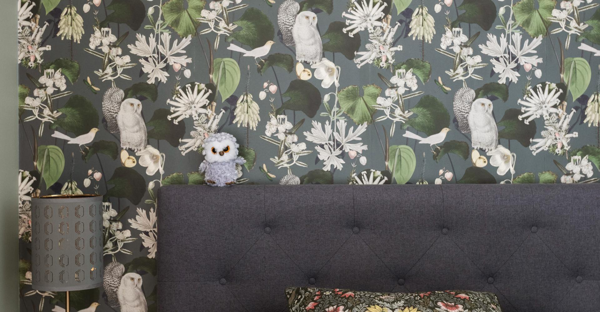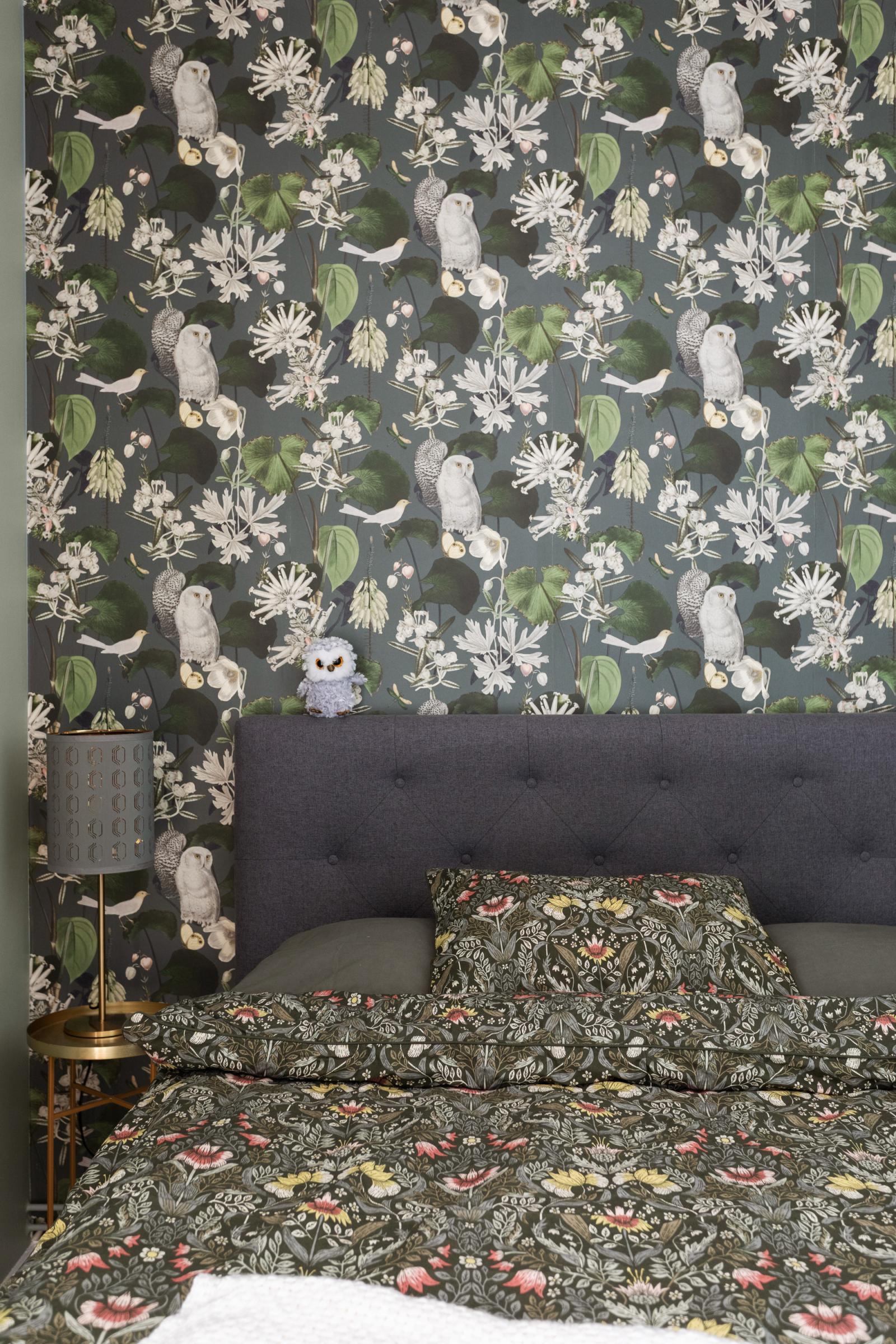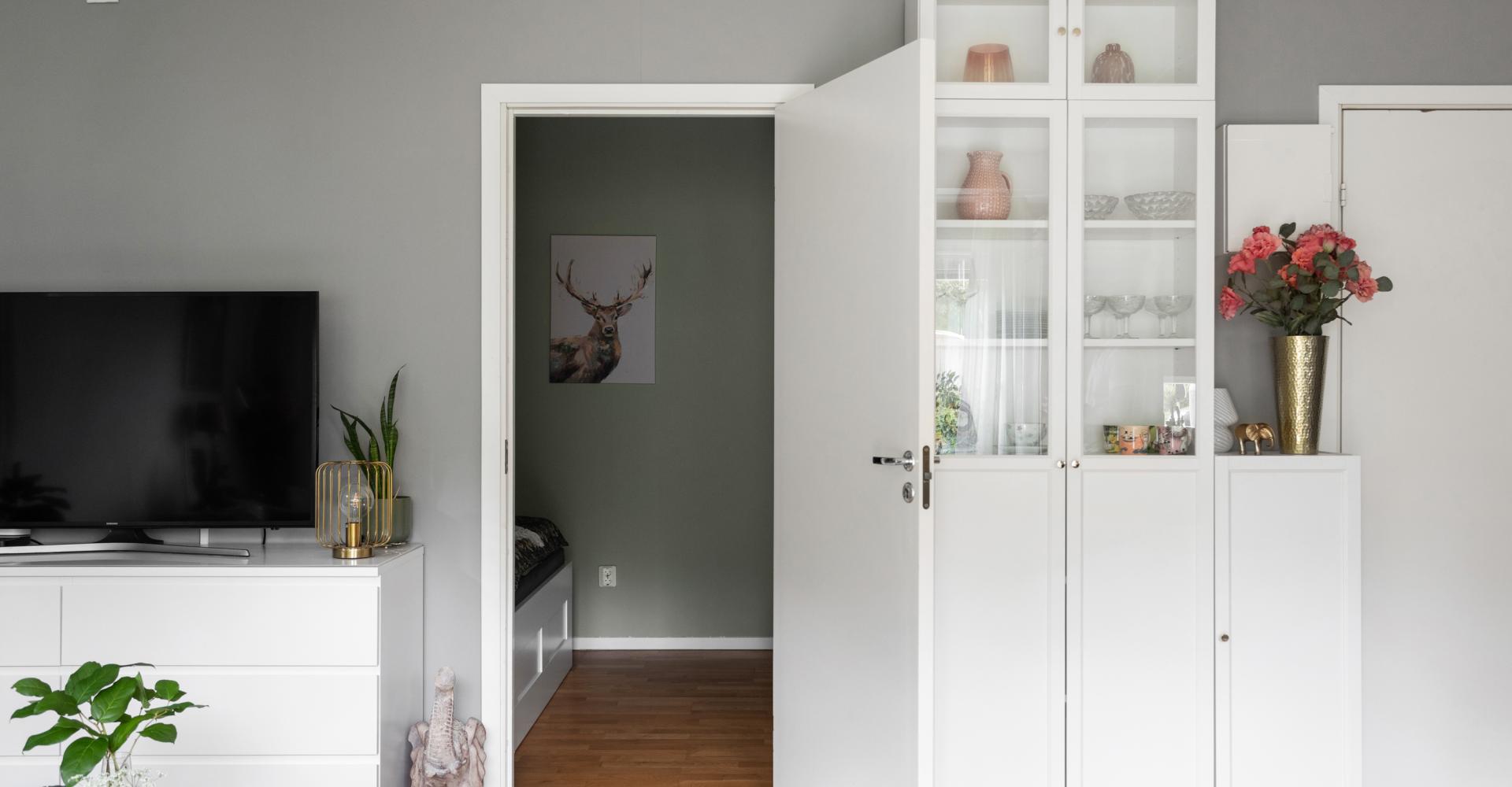 Lägenheten är registrerad som 2:a i föreningen, men det saknas fönster med direkt dagsljus så jag som mäklare behöver säga att lägenheten har 1,5 rum. I rummet finns plats för 180 cm bred säng, sängen på bilderna är 140 cm bred. Väggarna i sovrummet är målade i grågrön nyans samt en tapetserad fondvägg med nattugglor. Till höger om dörren in till sovrummet ryms en hel garderobsvägg.