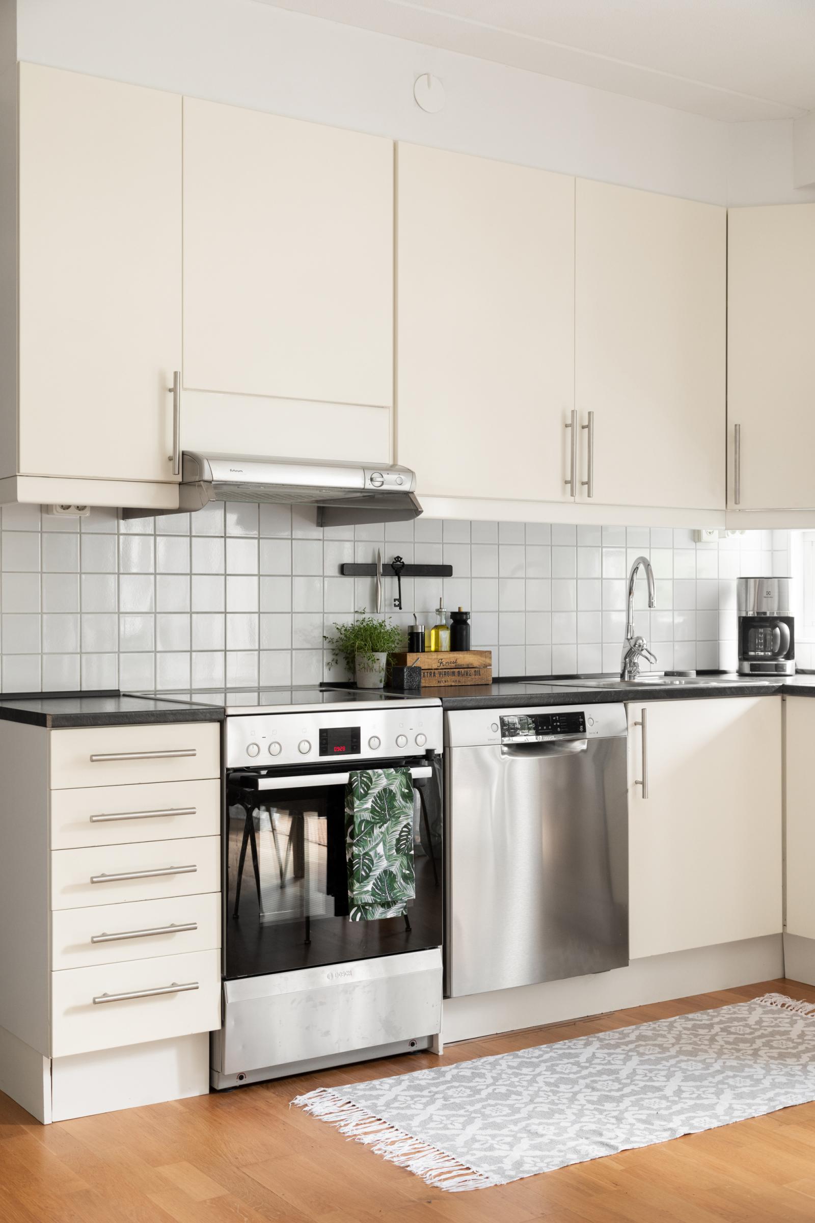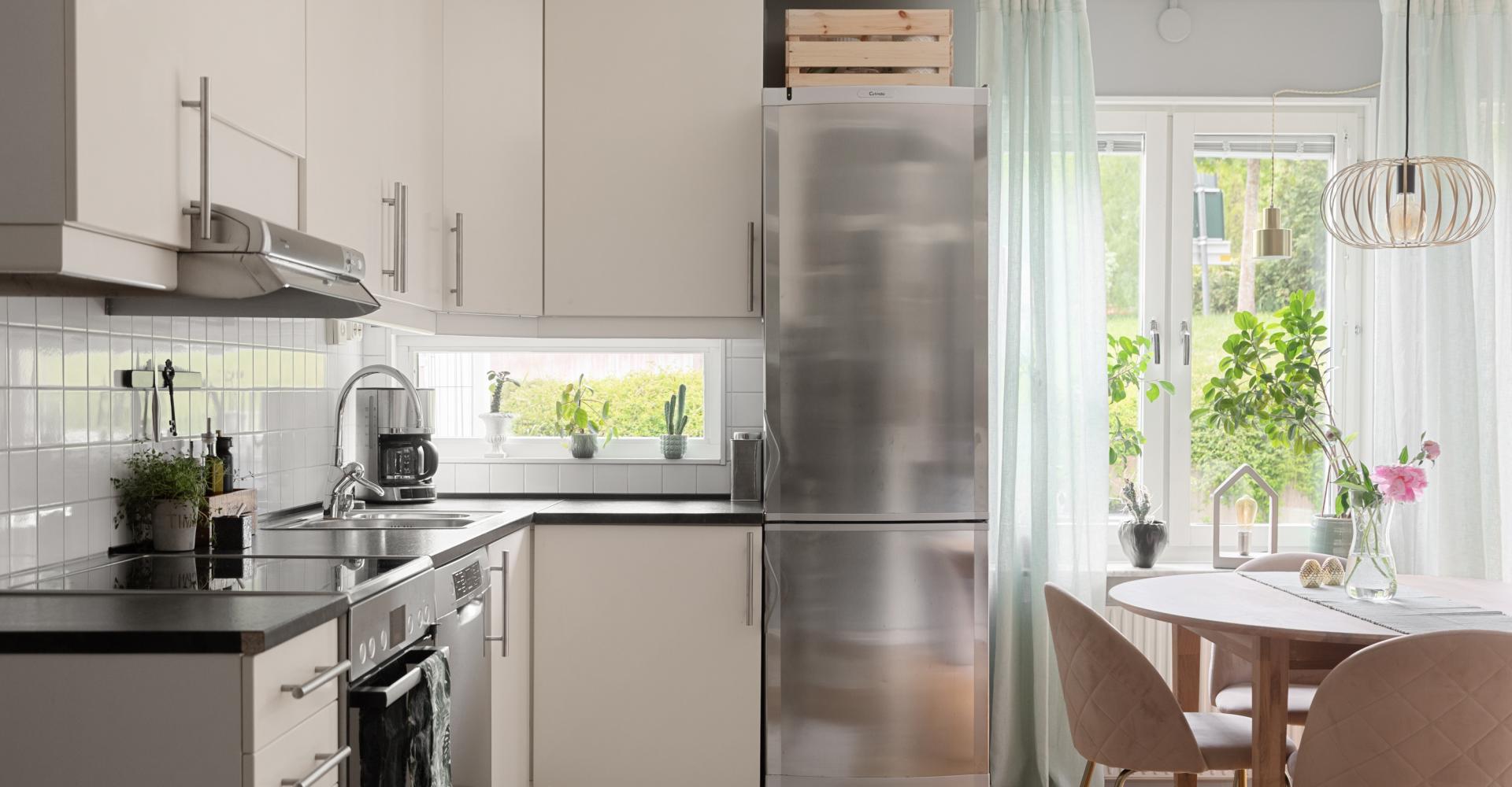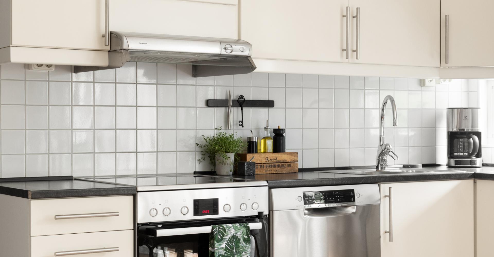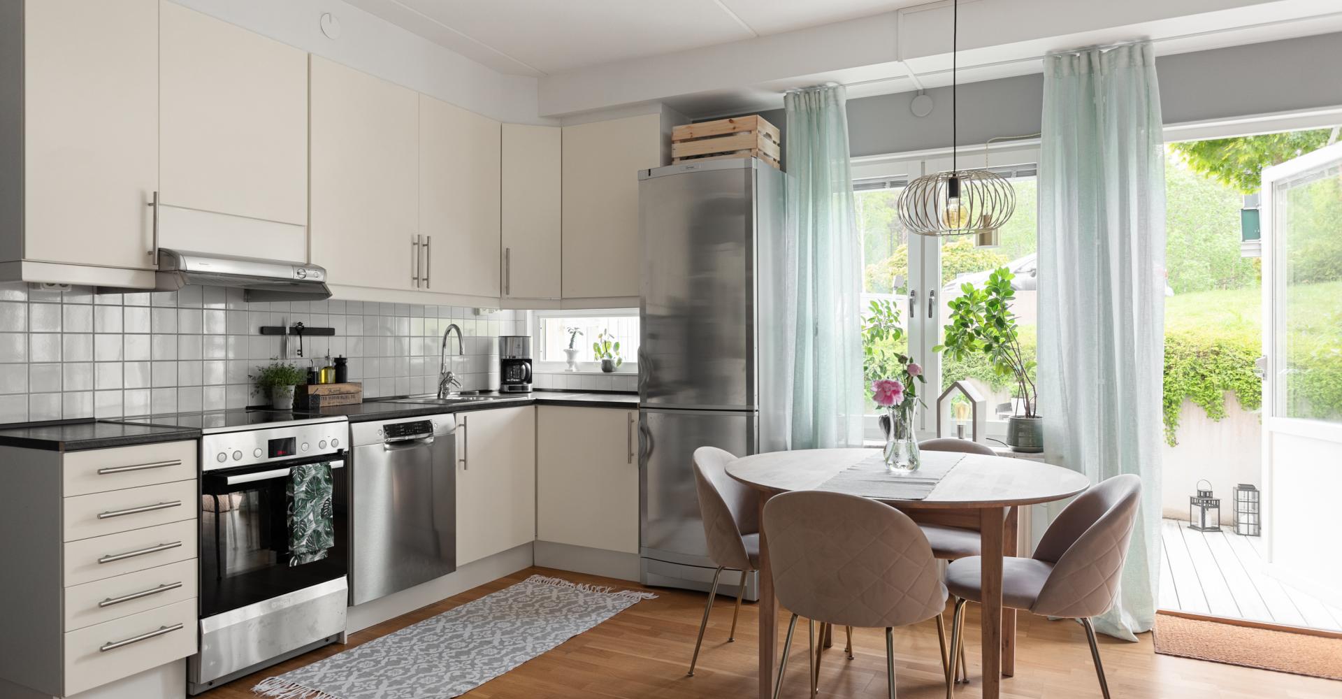 Modernt kök med ljusa skåps- och lådfronter. Vitt kakel ovan disk- och arbetsbänk som är i mörkt grått laminat. Fönster mot terrassen. Utrustningen består av induktionshäll, ugn och fläkt samt diskmaskin, kyl och frys i rostfritt utförande. Köket har, som i övriga lägenheten, trägolv och grå målade väggar.