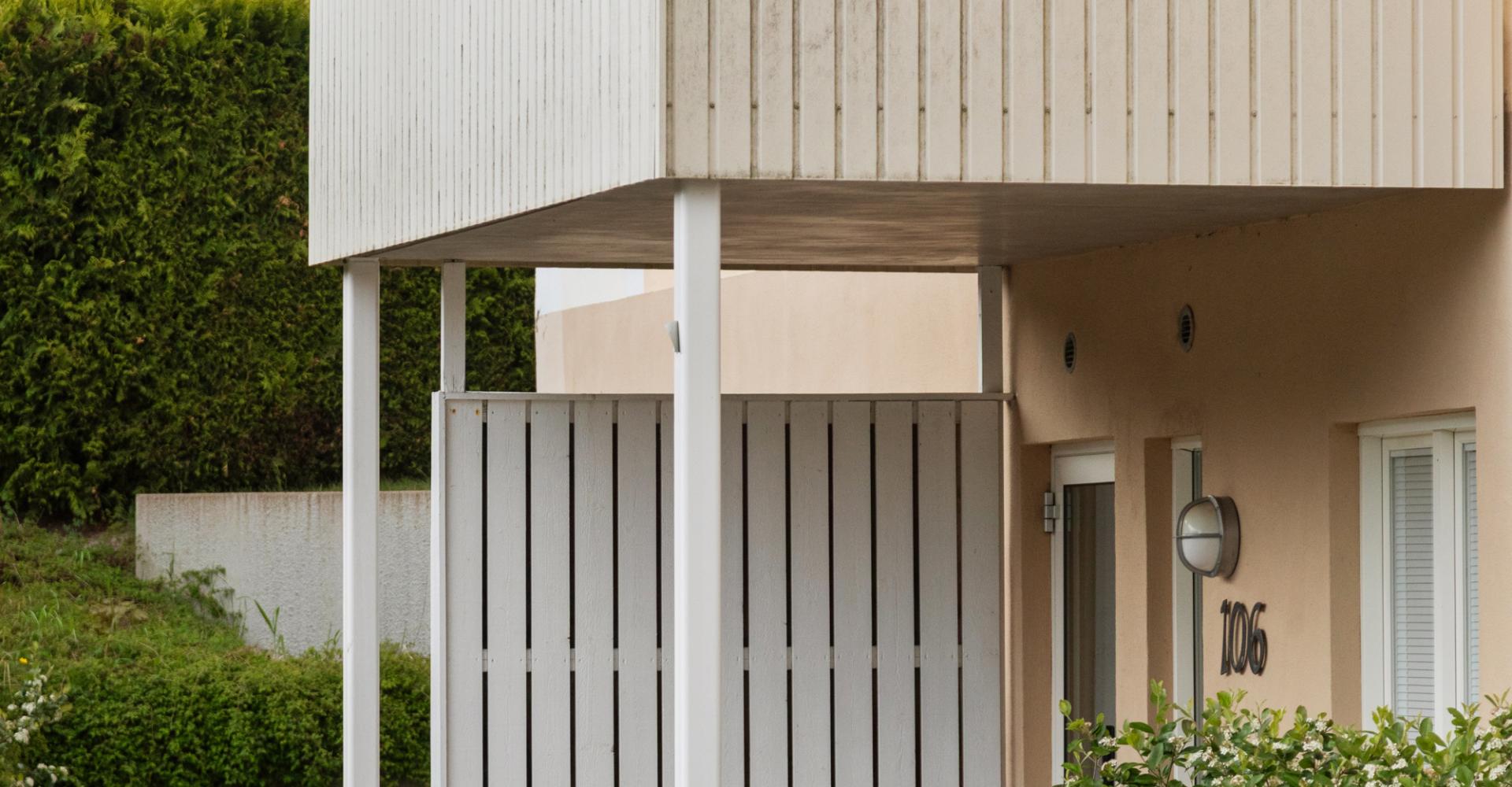 Gemensamma ytor utgörs av cykelförråd, en lekplats och en mindre byggnad för sopor och trädgårdsredskap.